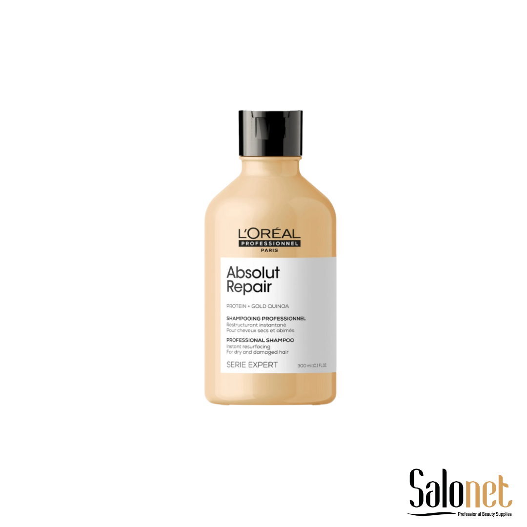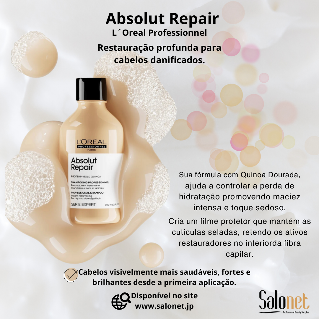 Shampoo de tratamento da linha Absolut Repair Gold Quinoa contém quinoa dourada e proteína de trigo. A fórmula profissional repara e nutre instantaneamente os fios e proporciona um cabelo mais leve, reparado, brilhante e suave sem deixar o cabelo pesado ou rígido.